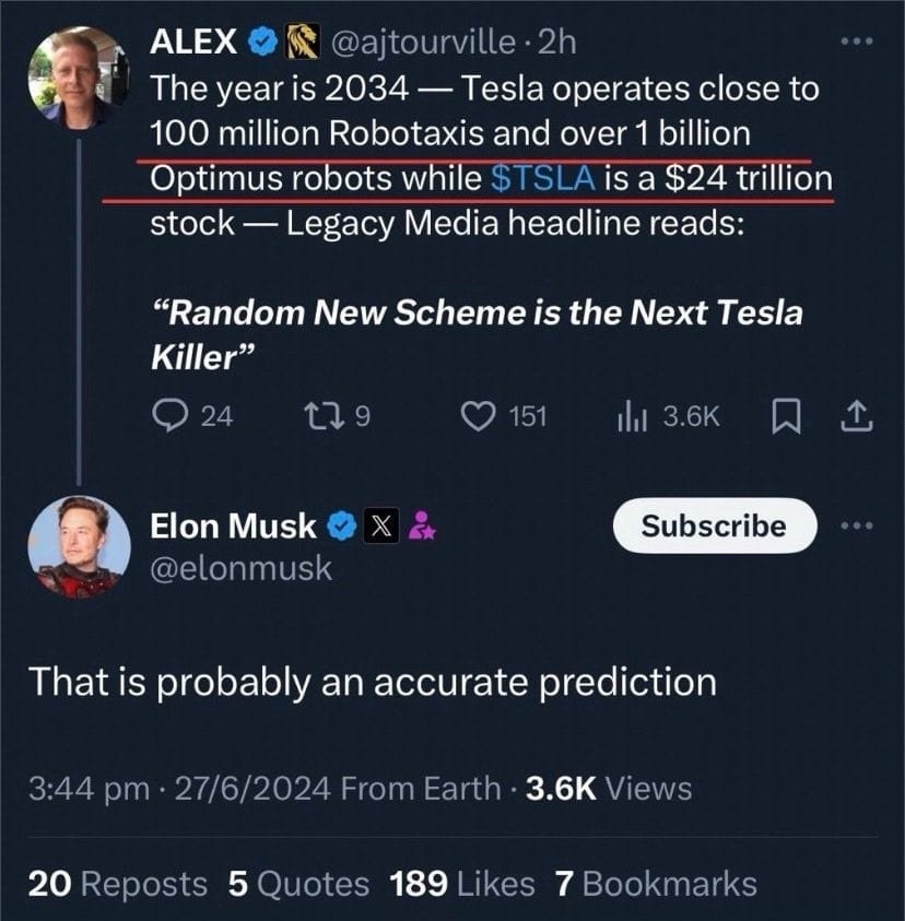 In a tweet last night made by Alex Tourville (physics engineer and creator of X’s logo), he mentioned his thoughts as to how TSLA will reach $24 trillion in the next 10 years thanks to CyberCabs and Optimus robots.